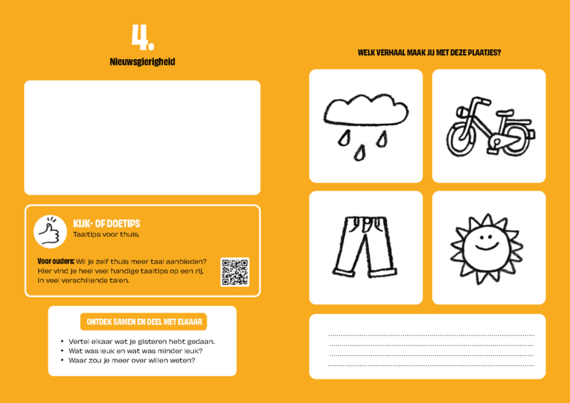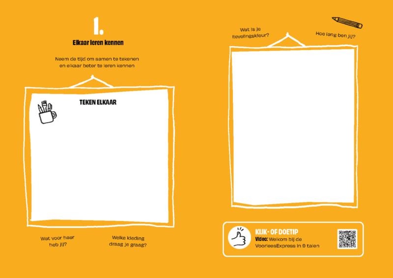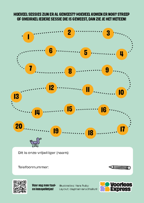 Het Doeboek voor de VoorleesExpress is een speels vormgegeven schriftje op A5 formaat, waarmee vrijwilliger, kind en ouder samen hun sessie kunnen afronden. Het staat vol met leuke opdrachten, tips, QR codes en suggesties voor onderwerpen waarover ze samen in gesprek kunnen gaan. Het ondersteunt hiermee het contact met ouders, de inzet van digitaal aanbod en het overzicht in het verloop van het traject.
